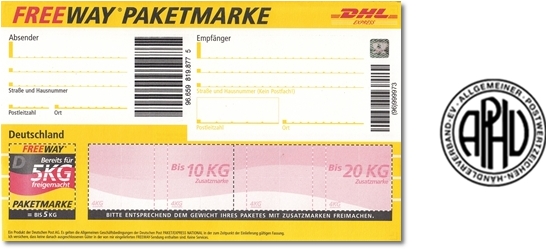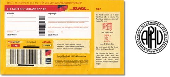 2kg, 5kg, 10kg, 20kg und 31,5kg Päckchen und Paketmarken von DHL, gelb mit Hologramm, für den deutschlandweiten Versand